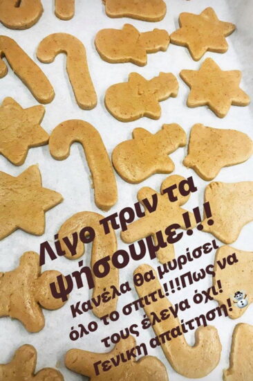 Αυτή τη φορά, η Δέσποινα Βανδή έφτιαξε χριστουγεννιάτικα μπισκότα για την οικογένειά της, επιλέγοντας διάφορα σχήματα, αστέρι, χιονάνθρωπος, μπαστουνάκια κ.α. Στη συνέχεια έκανε ανάρτηση του επιτεύγματός της στα InstaStories της γράφοντας χαρακτηριστικά: «Λίγο πριν τα ψήσουμε!!! Κανέλα θα μυρίσει όλο το σπίτι!!! Πώς να τους έλεγα όχι! Γενική απαίτηση!».