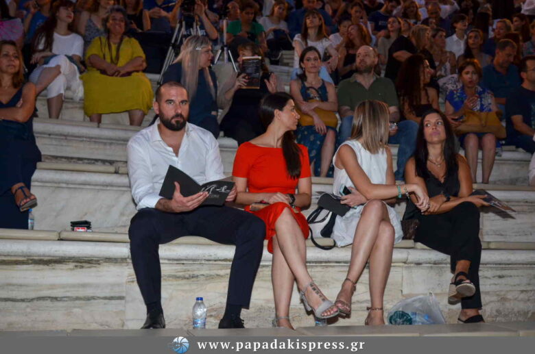 Δίπλα του, στις πρώτες θέσεις, καθόταν και μια όμορφη, μελαχρινή κοπέλα, η οποία εντυπωσίασε με το κόκκινο φόρεμά της. Ο κ. Τζανακόπουλος, διακριτικός αλλά ευγενικός με όσους έσπευσαν να τον χαιρετήσουν, ενημερώθηκε από το πρόγραμμα, το οποίο διάβασε με επιμέλεια και παρακολούθησε την παράσταση με ενδιαφέρον. Ήταν δε από τους πρώτους που χειροκρότησαν τους πρωταγωνιστές, ενώ δεν είχε κανένα πρόβλημα και με την κάμερα που βρέθηκε εκεί και τον φωτογράφησε.