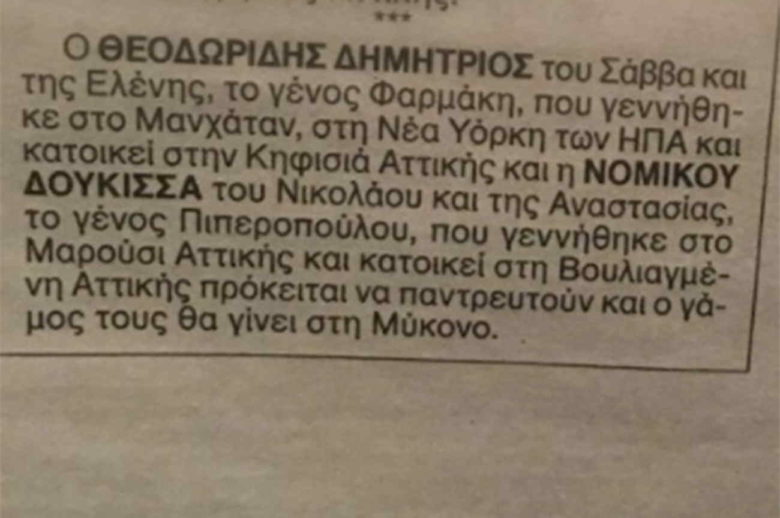 Το ζευγάρι, το οποίο μετρά αρκετά χρόνια σχέσης, θα ενώσει τις ζωές του στις 10 Ιουνίου στη Μύκονο. Η αναγγελία του γάμου του δημοσιεύτηκε στο «Ριζοσπάστη», την εφημερίδα της Κεντρικής Επιτροπής του Κομμουνιστικού Κόμματος Ελλάδας.