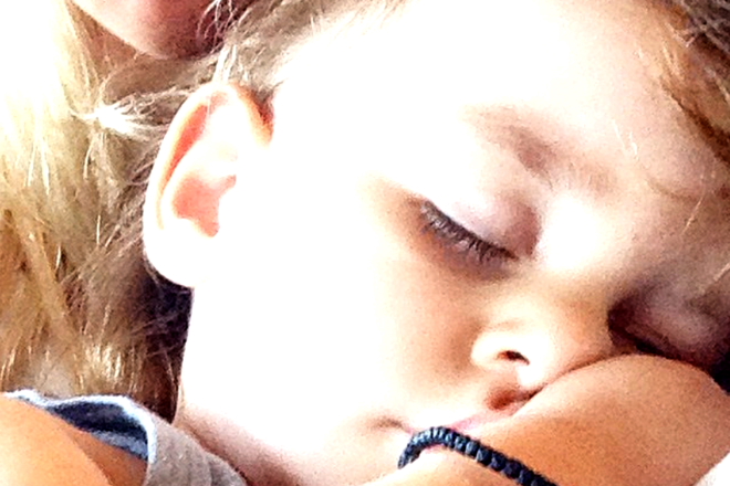 Αυτή τη φορά, η Δούκισσα Νομικού ποζάρει αγκαλιά με το βαφτιστήρι της, που κοιμάται στην αγκαλιά της, αναπολώντας το μονοήμερο ταξίδι τους στην Τήνο.