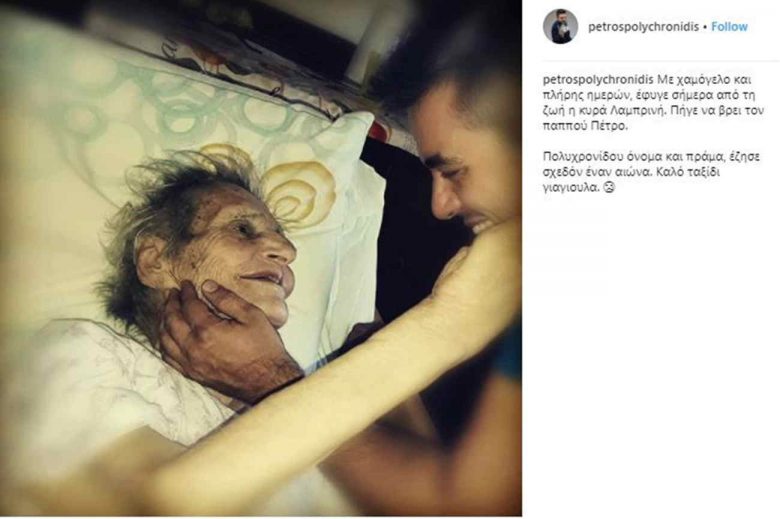 «Mε χαμόγελο και πλήρης ημερών, έφυγε σήμερα από τη ζωή η κυρά Λαμπρινή. Πήγε να βρει τον παππού Πέτρο. Πολυχρονίδου όνομα και πράμα, έζησε σχεδόν έναν αιώνα. Καλό ταξίδι γιαγιούλα».
