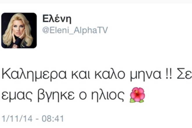 Η παρουσιάστρια υποδέχτηκε την πρώτη μέρα του Νοέμβρη με αισιοδοξία κι έτσι «ανέβασε» στο twitter για να καλημερίσει τους φίλους της και να τους ευχηρθεί «καλό μήνα».