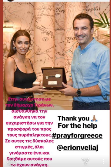 Επίσης ενώ βρισκόταν στα Τίρανα, η τραγουδίστρια συναντήθηκε με το δήμαρχο, Erion Veliaj, ο οποίος την ενημέρωσε πως η πόλη του θα διαθέσει προς τους πυρόπληκτους το ποσό των 50.000 ευρώ: «Σε αυτές τις δύσκολες στιγμές όλοι γινόμαστε ένα και βοηθάμε αυτούς που το έχουν ανάγκη», ανέφερε η Ελένη Φουρέιρα, η οποία παράλληλα επαίνεσε και την Κύπρο για την πρωτοβουλία της να διαθέσει 10 εκατομμύρια ευρώ στους πληγέντες.