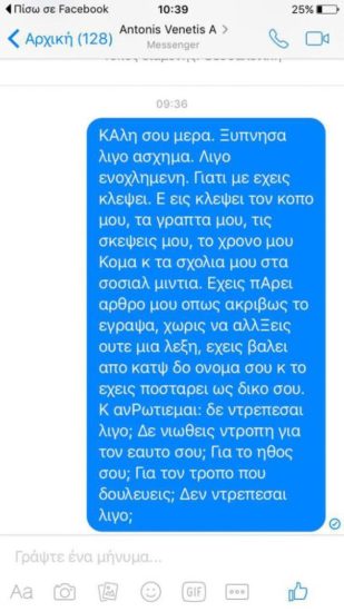 Όπως βλέπετε και στις φωτογραφίες, αφού πόσταρε το κείμενο μου ως δικό του, το ανακοίνωσε κιόλας στους φίλους του στο facebook κρατώντας ακόμα και το ίδιο δικό μου σχόλιο, από το χθεσινό δικό μου ποστάρισμα στο twitter.»