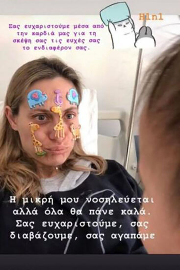 Στο Instastories μάλιστα έγραψε ότι η κορούλα της νοσηλεύεται στο νοσοκομείο με τον ιό της γρίπης Η1Ν1 και πως όλα θα πάνε καλά. Δεν παρέλειψε μάλιστα να ευχαριστήσει όσους έδειξαν ενδιαφέρον, ενώ όπως ήταν φυσικό, οι ευχές και τα μηνύματα από τους διαδικτυακούς της φίλους ήταν πάρα πολλά.