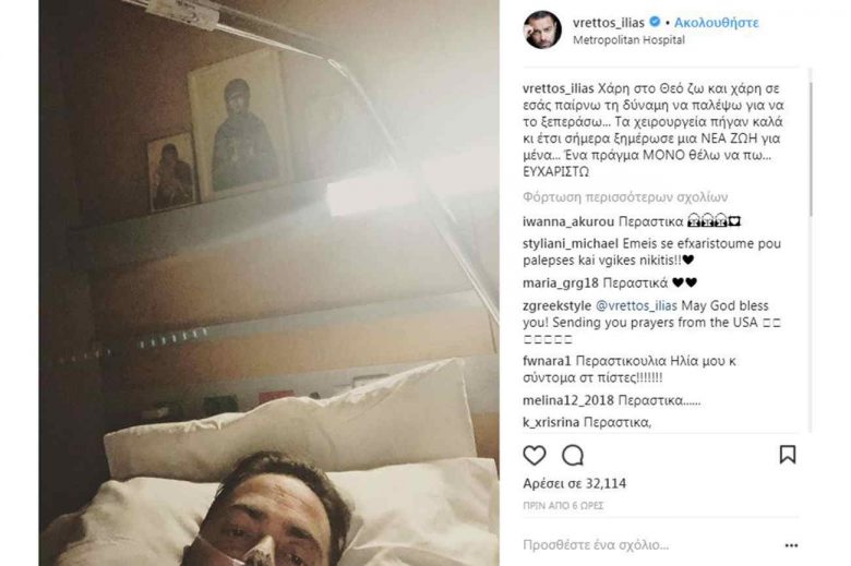 Μια φωτογραφία στο Instagram μέσα από το νοσοκομείο δημοσίευσε ο Ηλίας Βρεττός, μετά το δεύτερο χειρουργείο στο οποίο υποβλήθηκε.