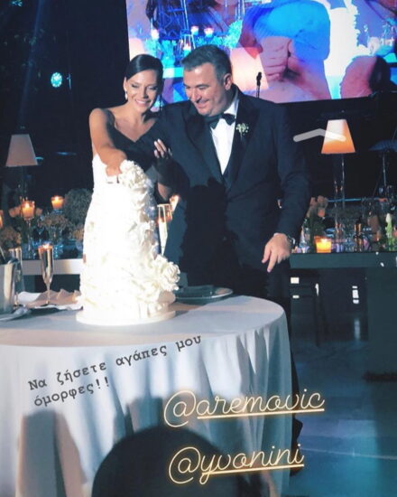 Κατά την είσοδο του ζευγαριού στο χώρο της δεξίωσης ακούστηκε το τραγούδι του Αντώνη Ρέμου «Μέχρι το τέλος του κόσμου» αμέσως μετά και πριν κόψουν τη γαμήλια τούρτα, ο γνωστός τραγουδιστής έκανε μια σπάνια δημόσια ερωτική εξομολόγηση στη σύζυγό του, Υβόννη. .