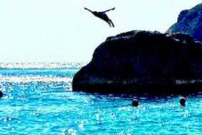 Θαρραλέος ο νεαρός τραγουδιστής, δεν δίστασε να σκαρφαλώσει στα βράχια και να βουτήξει από μεγάλο ύψος στο νερό. Οι φίλοι του απαθανάτισαν την στιγμή.