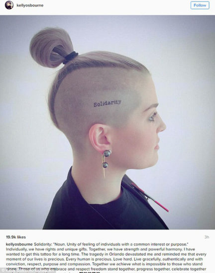 Έτσι σε φωτογραφία που ανέβασε στον προσωπικό της λογαριασμό στο Instagram, «χτύπησε» ένα νέο tattoo στο κρανίο της με την λέξη «αλληλεγγύη».