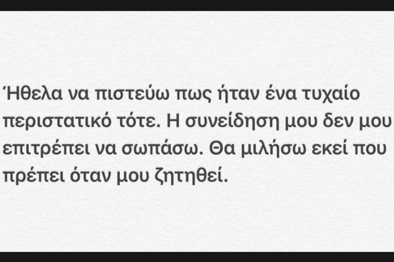 Έτσι, έκανε μια ανάρτηση στο Instagram, με σαφείς υπαινιγμούς, ενώ αφήνει να εννοηθεί ότι θα μιλήσει όπου και όποτε της ζητηθεί: «Ήθελα να πιστεύω πως ήταν ένα τυχαίο περιστατικό τότε. Η συνείδησή μου δεν μου επιτρέπει να σωπάσω. Θα μιλήσω εκεί που πρέπει όταν μου ζητηθεί» έγραψε χαρακτηριστικά.