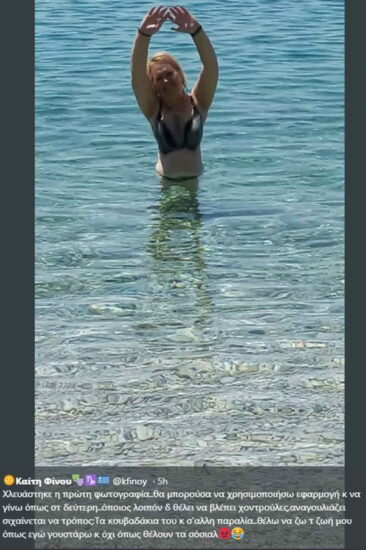 «Όποιος δεν θέλει να βλέπει χοντρούλες τα κουβαδάκια του και σε άλλη παραλία». Με αυτό τον τρόπο αλλά και ένα έξυπνο photoshop, απάντησε η Καίτη Φίνου σε όσους έσπευσαν να τη χλευάσουν για μια φωτογραφία που ανέβασε από παραλία.