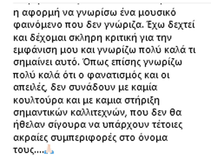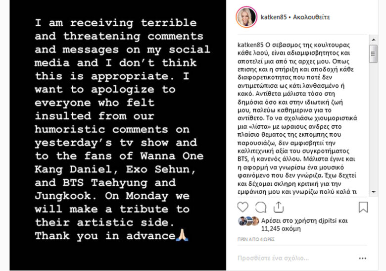 Η παρουσιάστρια απάντησε με ένα κείμενο στο Instagram, λέγοντας ταυτόχρονα ότι δέχεται απειλητικά μηνύματα για τη ζωή της…