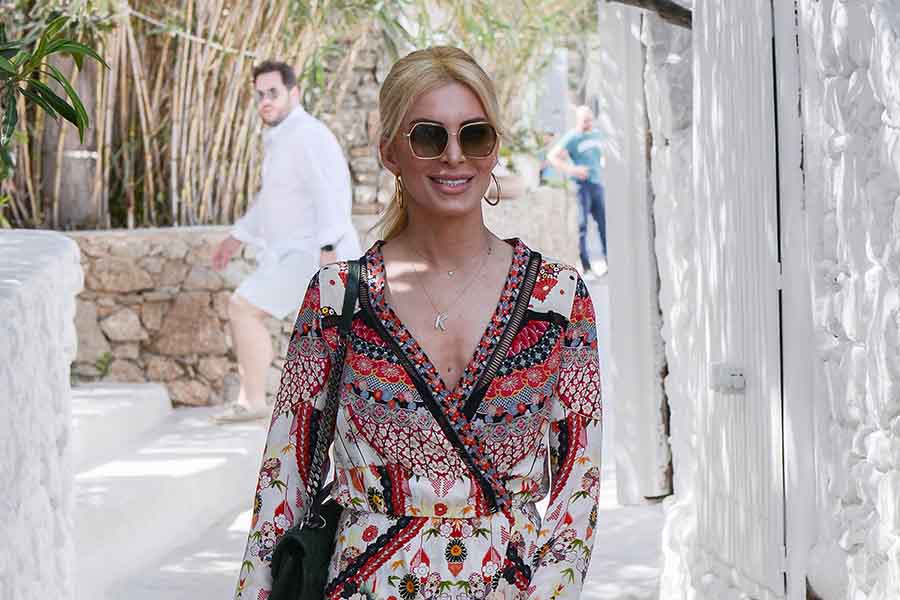 Ο φωτογραφικός μας φακός τη συνάντησε στα σοκάκια του νησιού, ενώ έκανε τη βόλτα της φορώντας ένα αέρινο φόρεμα και ένα ζευγάρι μεγάλα γυαλιά ηλίου. Φυσικά η παρουσία της δεν πέρασε απαρατήρητη ωστόσο η ίδια φρόντισε να είναι όσο το δυνατόν πιο διακριτική, ανταποκρινόταν όμως σε όσους την αναγνώριζαν και ανταπέδιδε με ένα λαμπερό χαμόγελο.