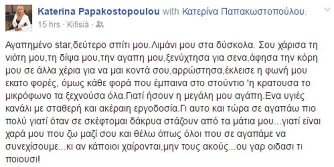 Πιο αναλυτικά, η παρουσιάστρια του δελτίου ειδήσεων του καναλιού της Κηφισιάς έγραψε σχετικά για το θέμα πως: «Αγαπημένο star, δεύτερο σπίτι μου. Λιμάνι μου στα δύσκολα. Σου χάρισα τη νιότη μου, τη δίψα μου, την αγάπη μου, ξενύχτησα για σενα,άφησα την κόρη μου σε άλλα χέρια για να ‘μαι κοντά σου, αρρώστησα, έκλεισε η φωνή μου εκατό φορές, όμως κάθε φορά που έμπαινα στο στούντιο ή κρατούσα το μικρόφωνο τα ξεχνούσα όλα.Γιατί ήσουν η μεγάλη μου αγάπη. Ένα υγιές κανάλι με σταθερή και ακέραιη εργοδοσία. Γι’ αυτό και τώρα σε αγαπάω πιο πολύ γιατί όταν σε σκέφτομαι δάκρυα στάζουν από τα μάτια μου…γιατί είναι χαρά μου που ζω μαζί σου και θέλω όπως όλοι που σε αγαπάμε να συνεχίσουμε…κι αν κάποιοι χαίρονται, μην τους ακούς…ου γαρ οιδασι τι ποιουσι!».