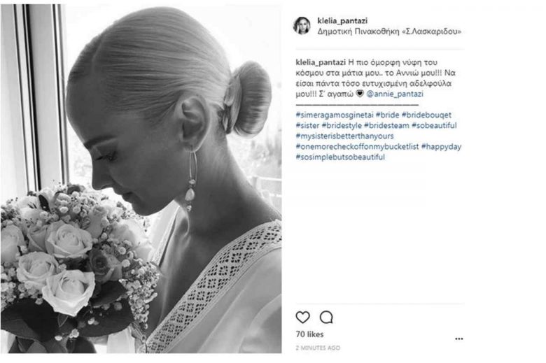 «Η πιο όμορφη νύφη του κόσμου στα μάτια μου.. το Αννιώ μου!!! Να είσαι πάντα τόσο ευτυχισμένη αδελφούλα μου!!! Σ’ αγαπώ!”» ήταν τα συγκινητικά λόγια της με τα οποία συνόδευσε η Κλέλια Πανταζή τη φωτογραφία της αδερφής της.