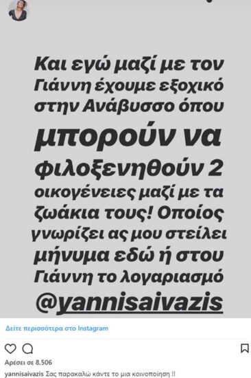 Το ζευγάρι, αποφάσισε να δώσει την εξοχική του κατοικία προκειμένου να φιλοξενηθούν σε αυτή πληγέντες των φονικών πυρκαγιών. Πιο συγκεκριμένα, με ανάρτησή τους, ανέφεραν ότι διαθέτουν την εξοχική τους κατοικία στην Ανάβυσσο, στην οποία ανακοίνωσαν πως μπορούν να φιλοξενήσουν δύο οικογένειες με τα ζωάκια τους.