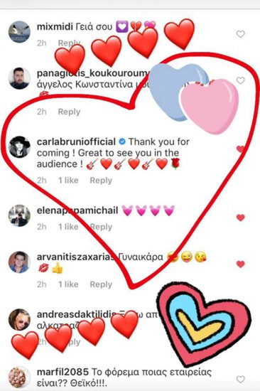 Αμέσως μετά το τέλος της εκδήλωσης, η Κωνσταντίνα δέχθηκε ένα μήνυμα στο Instagram από την πρώην Πρώτη Κυρία της Γαλλίας, η οποία ευχαριστούσε την παρουσιάστρια για την παρουσία της στη συναυλία της.