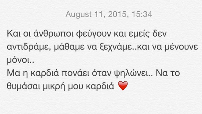 Ωστόσο, αυτό που έκανε εντύπωση είναι οι στίχοι που η παρουσιάστρια του Alpha ανέβασε στο προσωπικό της προφίλ και οι οποίοι προέρχονται από το τραγούδι «Η καρδιά πονάει όταν ψηλώνει» της Νατάσσας Μποφίλιου. Τι ακριβώς συμβαίνει με την Κωνσταντίνα Σπυροπούλου; Πάντως, τα δοκιμαστικά για την εκπομπή της θα συνεχιστούν κανονικά μετά τον 15αυγουστο!