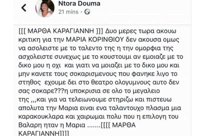 Η Μάρθα Καραγιάννη θέλοντας να στηρίξει την Μαρία Κορινθίου, ανέβασε στον προσωπικό λογαριασμό της καλής της φίλης και συνεργάτιδας, Δώρας Δούμα ένα κείμενο, με το οποίο απαντά σε όσους επέκριναν την Μαρία Κορινθίου.