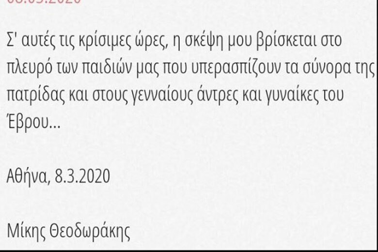 «Σ’ αυτές τις κρίσιμες ώρες, η σκέψη μου βρίσκεται στο πλευρό των παιδιών μας που υπερασπίζουν τα σύνορα της πατρίδας και στους γενναίους άντρες και γυναίκες του Έβρου…» ανέφερε το μήνυμα του κ. Θεοδωράκη κι όπως ήταν φυσικό, πολλοί ήταν εκείνοι που έσπευσαν να τον συγχαρούν για την πρωτοβουλία του.