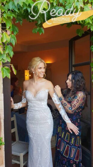 Η νύφη έφτασε την ώρα που έδυε ο ήλιος στη θάλασσα και έλαμπε μέσα στο γοργονέ νυφικό της δια χειρός Στάλως Θεοδώρου. Ο γαμπρός την περίμενε με ανυπομονησία και εκείνη φτάνοντας του έδωσε ένα τρυφερό φιλί.