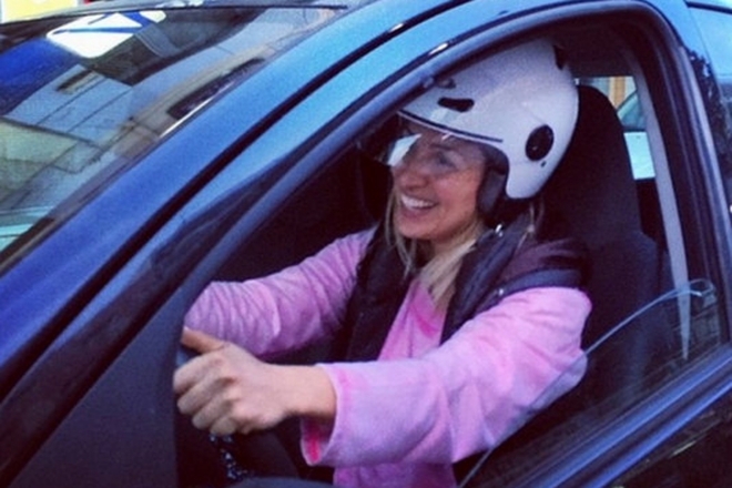Φορώντας κράνος, η Μαρία Ηλιάκη απεικονίζεται να οδηγεί το αυτοκίνητό της και την ίδια να γελά με την ψυχή της. Ή μήπως είναι απλώς η αυθόρμητη αντίδραση μιας…αρχάριας οδηγού;