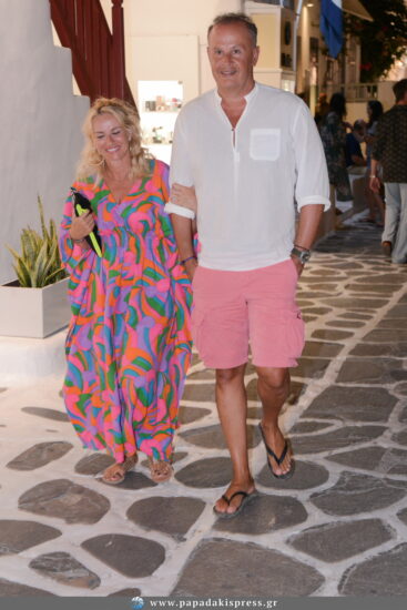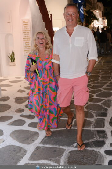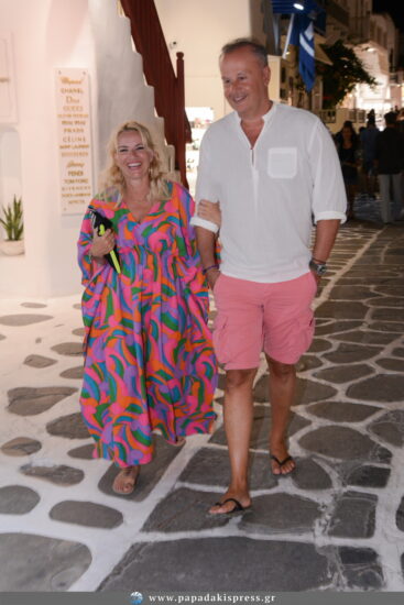 Εκεί τους συνάντησε ο φωτογραφικός μας φακός, ενώ έκαναν βόλτα στα σοκάκια του νησιού. Το ζευγάρι, απολάμβανε μια βραδινή, καλοκαιρινή έξοδο και η διάθεση ήταν χαλαρή και ευχάριστη, όπως φαίνεται και από τα χαμόγελα που μας χάρισαν.