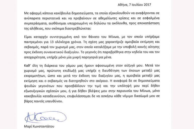 Ακολουθεί η επιστολή της Μαρί Κωνσταντάτου: «Με αφορμή κάποια κακόβουλα δημοσιεύματα τα οποία εξακολουθούν να αναφέρονται σε ανύπαρκτα περιστατικά και να προβαίνουν σε αθεμελίωτες κρίσεις και σε εσφαλμένα συμπεράσματα, αισθάνομαι υποχρεωμένη να δηλώσω τα ακόλουθα προς αποκατάσταση της αλήθειας που σκόπιμα διαστρεβλώνεται: Είμαι καταρχήν συντετριμμένη με το θάνατο του Μίνωα με τον οποίο υπήρξαμε παντρεμένοι για 13 ολόκληρα χρόνια. Τη σχέση μας χαρακτήριζε αμοιβαία εκτίμηση και σεβασμός. Παρά τον χωρισμό μας στον οποίο καταλήξαμε με την υποβολή κοινής αίτησης προς έκδοση συναινετικού διαζυγίου. Το γεγονός ότι παραβρέθηκα στην κηδεία του και τον αποχαιρέτισα υπήρξε μόνο μια μικρή παρηγοριά για μένα. Καθ’ όλη την διάρκεια του γάμου μας ήμουν αφοσιωμένη στο σύζυγό μου. Μετά τον χωρισμός μας, πρώτιστη επιδίωξή μας υπήρξε η διευθέτηση των όποιων μεταξύ μας εκκρεμοτήτων, ώστε και μετά την έκδοση του διαζυγίου μας, η αμοιβαία μεταξύ μας εκτίμηση και σεβασμός να διατηρηθούν στο ακέραιο. Η αναφορά δε σε δημοσιεύματα ψευδών γεγονότων που προσβάλουν την τομή και την υπόληψη μου περί δήθεν εξωσυζυγικών σχέσεών μου ή για δήθεν βλέψεις μου στην περιουσία του Μίνωα μόνο κακοβουλία καταδεικνύουν. Επιφυλάσσομαι δε να ασκήσω κάθε νόμιμο δικαίωμα μου σε βάρος παντός υπευθύνου».