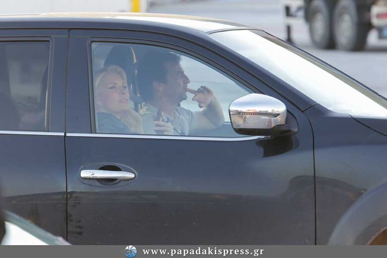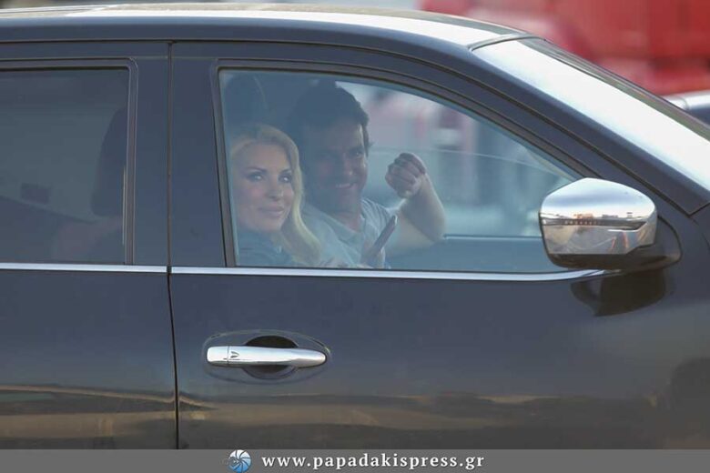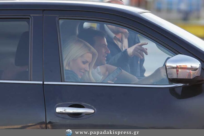 Ο φωτογραφικός μας φακός, τους συνάντησε στο λιμάνι της Ραφήνας λίγο πριν αναχωρήσουν με το πλοίο της γραμμής για το νησί των Κυκλάδων. Η παρουσιάστρια ήταν χαμογελαστή κι ευδιάθετη, γεγονός που σε μεγάλο βαθμό οφειλόταν στο ότι έφευγε για λίγο μακριά από τα επαγγελματικές υποχρεώσεις και πήγαινε στην Άνδρο, η οποία έχει εξελιχθεί για εκείνη στο μικρό της παράδεισο.
