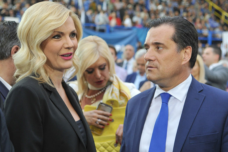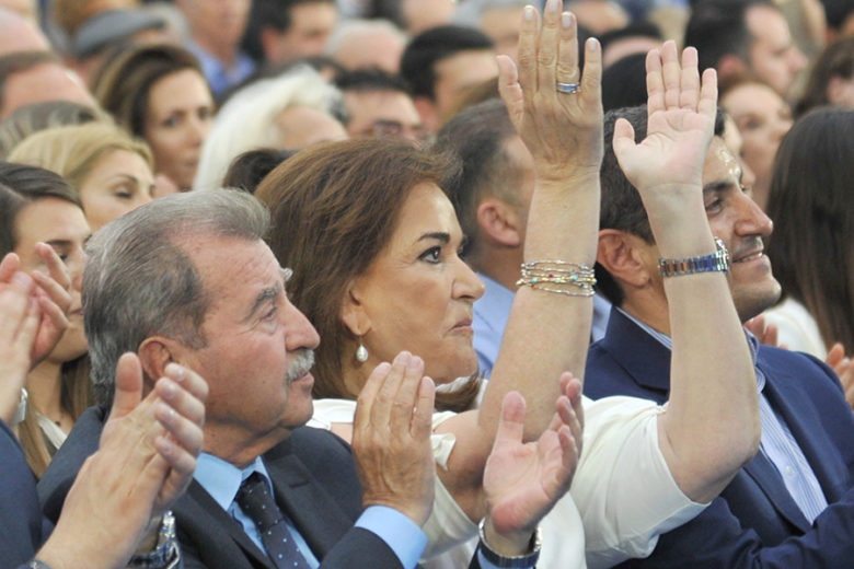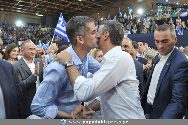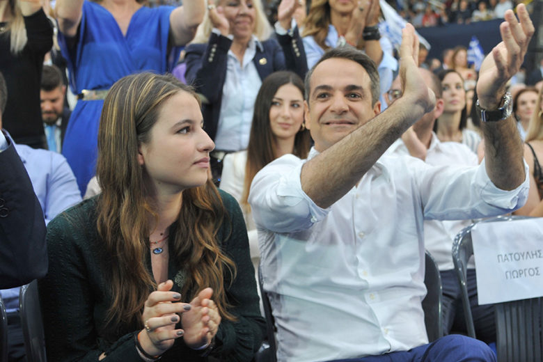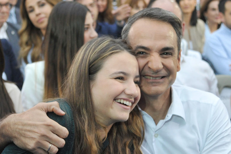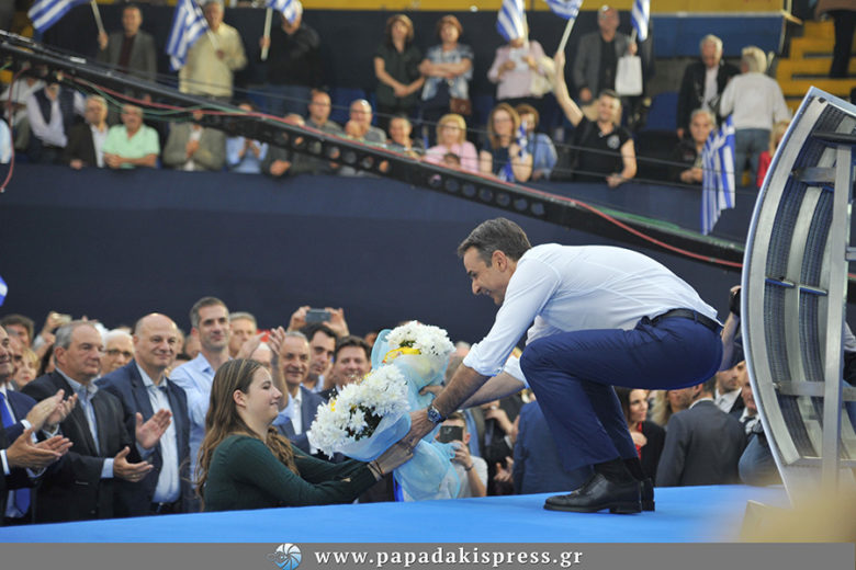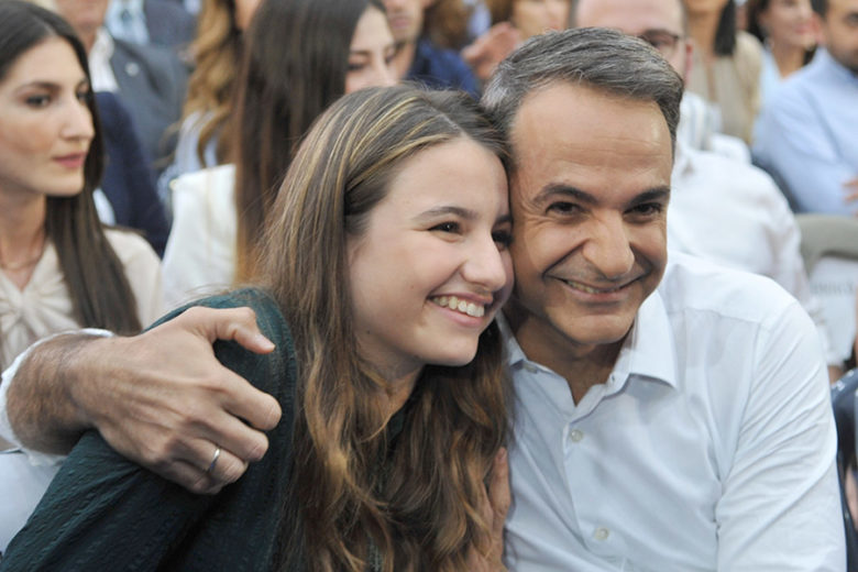 Ένα μεγάλο μπουκέτο λουλούδια και μια τρυφερή αγκαλιά, δέχθηκε από την κόρη του Δάφνη ο Κυριάκος Μητσοτάκης στην κεντρική προεκλογική του ομιλία στο Περιστέρι.
