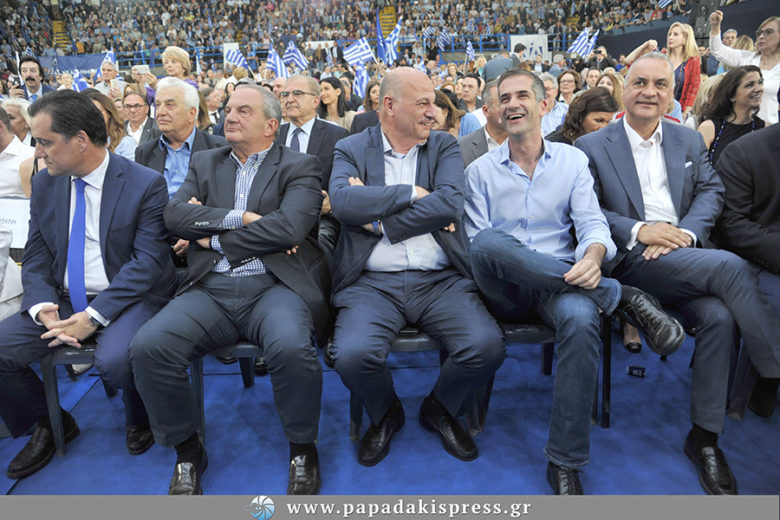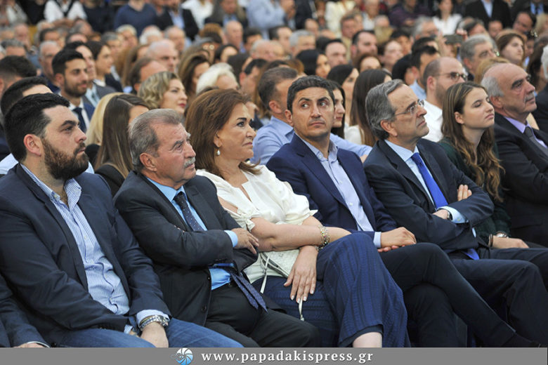 Ο Πρόεδρος της Νέας Δημοκρατίας, στο κατάμεστο κλειστό γήπεδο, είχε στο πλευρό του και τα μέλη της οικογένειάς τους. Εκεί ήταν οι αδελφές του Ντόρα Μπακογιάννη και Κατερίνα Μητσοτάκη, ο ανιψιός του Κώστας Μπακογιάννης και η κόρη του Δάφνη. Εκείνη βρισκόταν συνεχώς δίπλα του, χαμογελαστή και κρατώντας το χέρι του. Από εκείνη δέχτηκε μια τρυφερή αγκαλιά λίγο πριν την ομιλία του και ένα μεγάλο μπουκέτο λουλούδια μετά την ολοκλήρωση αυτής.