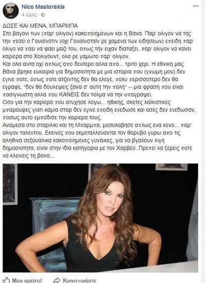 «Εκείνες που εκμεταλλεύονται τον θόρυβο γύρω από τις αληθινά σεξουαλικά κακοποιημένες γυναίκες, για να βγάλουν λίγη δημοσιότητα, είναι στην ίδια κατηγορία με τον Χαρβεϋ», έγραψε ο Νίκος Μαστοράκης ασκώντας έτσι αυστηρή κριτική στη Βάνα Μπάρμπα, η οποία δήλωσε δημοσίως πως υπήρξε «παρ’ ολίγον» θύμα του παραγωγού του Hollywood.