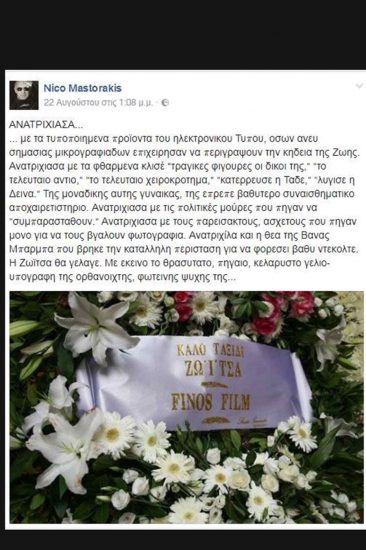 Ο δημοσιογράφος «επιτίθεται» μέσα από το κείμενό του στα ΜΜΕ για τον τρόπο με τον οποίο κάλυψαν την κηδεία της Ζωής Λάσκαρη και σχολιάζει με καυστικό τρόπο τη στάση των πολιτικών προσώπων και τη στιλιστική επιλογή της Βάνας Μπάρμπα. Συγκεκριμένα, ο Νίκος Μαστοράκης γράφει στην ανάρτησή του: