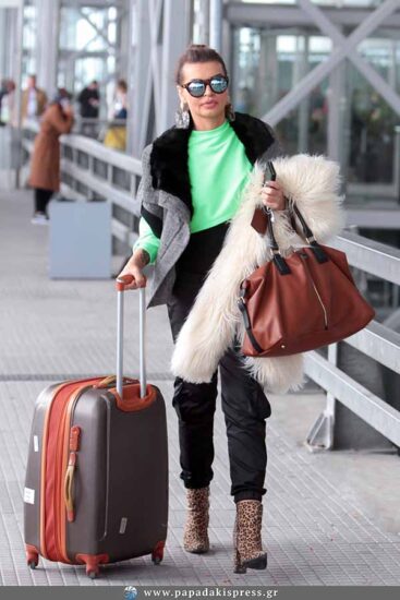 Ο φωτογραφικός μας φακός, συνάντησε την γνωστή καλλιτέχνιδα στο αεροδρόμιο Θεσσαλονίκης και μας έκανε εντύπωση ο τρόπος με τον οποίο είχε συνδυάσει τόσες πολλές διαφορετικές τάσεις και στυλ, σε μια εμφάνιση.