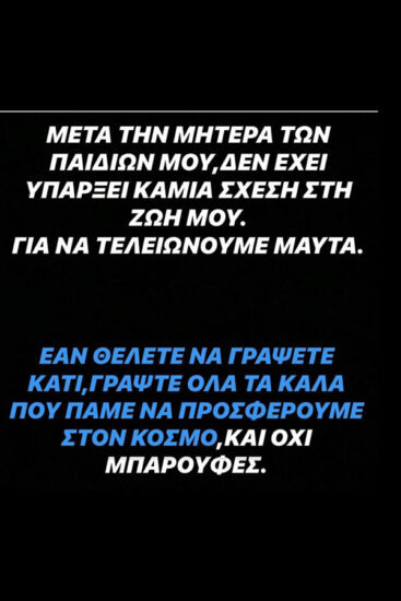 Ωστόσο με οργισμένο τρόπο, ο τραγουδιστής απάντησε στα δημοσιεύματα διευψεύδοντας τις πληροφορίες και το ότι είναι ζευγάρι. Με ανάρτησή του ξεκαθάρισε πως μετά το γάμου του με την πρώην σύζυγό του, Χρυσή Βαρδινογιάννη δεν έχει κάνει άλλη σχέση: «Μετά τη μητέρα των παιδιών μου δεν έχει υπάρξει καμία σχέση στη ζωή μου. Για να τελειώνουμε με αυτά», σημείωσε ο δημοφιλής καλλιτέχνης.