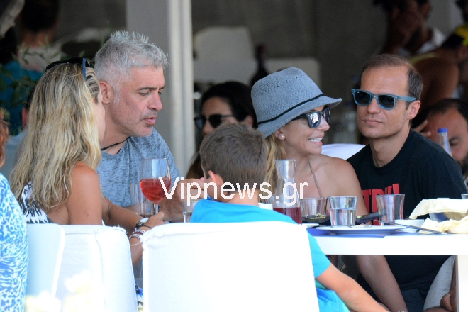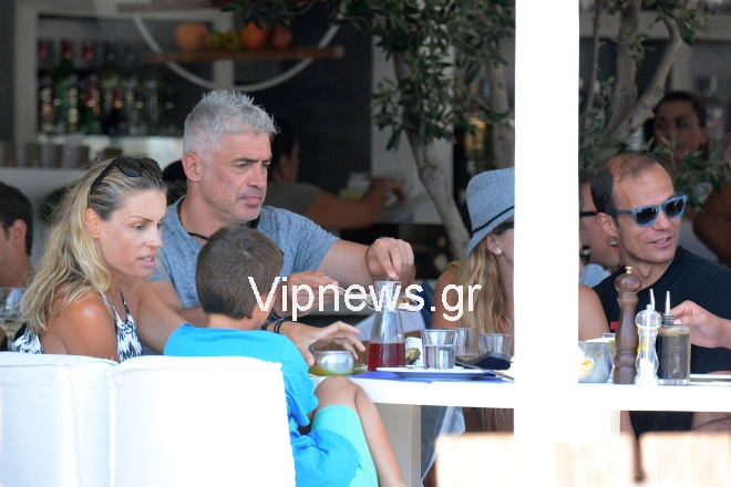 Ο Αντώνης Νικοπολίδης, που επισκέφθηκε για λίγο το νησί, αφού λόγω επαγγελματικών υποχρεώσεων έπρεπε να επιστρέψει στην Αθήνα, μαζί με τη σύζυγό του, Βάσω Στασινού, και τα τρία τους παιδιά, τον 14χρονο, Γιάννη και τα δίδυμα, Γιώργο και Μαριτίνα που είναι επτά ετών, έδειχναν να διασκεδάζουν έχοντας συντροφιά τον Άγγελο Μπασινά με τη σύζυγό του, Βιβή, και τις δύο κόρες τους, Βαλέρια και Αλεσάντρα.
