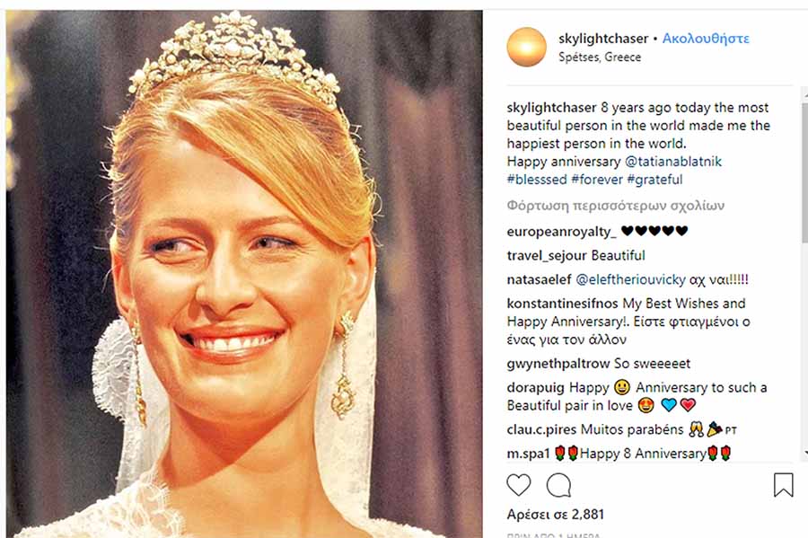 Ο γιος του τέως βασιλιά Κωνσταντίνου ανέβασε στον λογαριασμό του στο Instagram φωτογραφία της γυναίκας του από την ημέρα του γάμου τους και της έγραψε ένα πολύ τρυφερό μήνυμα: «8 χρόνια σήμερα από τότε που το ομορφότερο άτομο στον κόσμο με έκανε τον πιο ευτυχισμένο άνθρωπο του κόσμου. Happy anniversary @tatianablatnik #blesssed #forever #grateful».