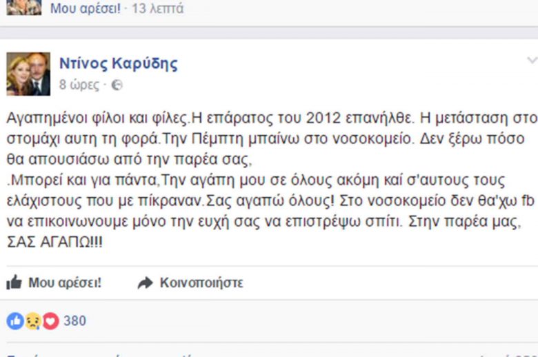 Ο γνωστός ηθοποιός έγραψε πως η επάρρατη νόσος επανήλθε μετά από πέντε χρόνια με μετάσταση στο στομάχι: «Αγαπημένοι φίλοι και φίλες. Η επάρατος του 2012 επανήλθε. Η μετάσταση στο στομάχι αυτη τη φορά. Την Πέμπτη μπαίνω στο νοσοκομείο. Δεν ξέρω πόσο θα απουσιάσω από την παρέα σας,. Μπορεί και για πάντα. Την αγάπη μου σε όλους ακόμη και σ’ αυτούς τους ελάχιστους που με πίκραναν. Σας αγαπώ όλους! Στο νοσοκομείο δεν θα ‘χω fb να επικοινωνούμε μόνο την ευχή σας να επιστρέψω σπίτι. Στην παρέα μας, ΣΑΣ ΑΓΑΠΩ!!!» έγραψε ο Ντίνος Καρύδης.