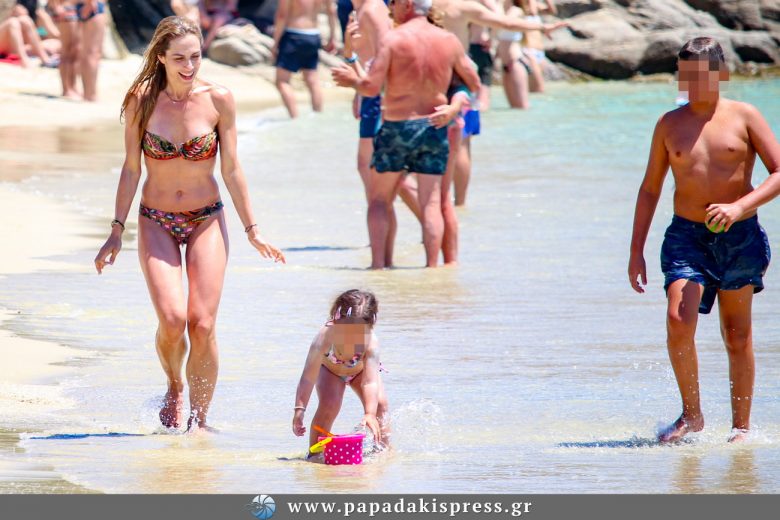 Ο φωτογραφικός μας φακός απαθανάτισε την Ντορέττα παρέα με τους άνδρες της ζωής της να κάνουν τις βουτιές τους στην παραλία «Πλατύς Γιαλός» της Μυκόνου και να χαίρονται το παιχνίδι και τη θάλασσα.