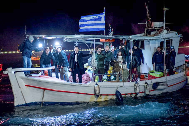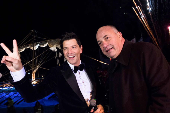 Ο Σάκης Ρουβάς έφθασε στο χώρο της εκδήλωσης δια θαλάσσης και φωταγώγησε το ψηλότερο δέντρο της χώρας, υπό τις επευφημίες των θαυμαστών του.