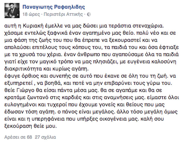 «Αυτή η Κυριακή έμελλε να μας δώσει μια τεράστια στεναχώρια. χάσαμε εντελώς ξαφνικά έναν αγαπημένο μας θείο. πολύ νέο και σε μια φάση της ζωής του που θα έπρεπε να ξεκουραστεί και να απολαύσει επιτέλους τους κόπους του, τα παιδιά του και όσα έφτιαξε με τα χρυσά του χέρια. έναν άνθρωπο που αγαπούσαμε όλα τα παιδιά γιατί είχε τον μαγικό τρόπο να μας πλησιάζει, με ευγένεια καλοσύνη διακριτικότητα και κυρίως αγάπη.