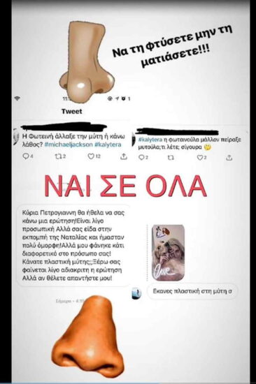Ο λόγος για την Φωτεινή Πετρογιάννη, η οποία όταν ρωτήθηκε από διαδικτυακούς της φίλους αν έκανε αισθητική επέμβαση, εμμέσως πλην σαφώς, το παραδέχθηκε. Ο διάλογος που έγινε στο Istagram έχει ως εξής: «Κυρία Πετρογιάννη θα ήθελα να σας κάνω μία ερώτηση. Είναι λίγο προσωπική. Σας είδα στην εκπομπή της Ναταλίας και ήσασταν πολύ όμορφη. Αλλά μου φάνηκε κάτι διαφορετικό στο πρόσωπό σας. Κάνατε πλαστικής τη μύτη σας; Ξέρω σας φαίνεται λίγο αδιάκριτη η ερώτηση, αλλά εάν θέλετε απαντήστε μου», της έστειλε ένας follower με την ίδια να απαντά «Ναι σε όλα»!