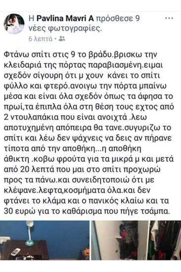 «Φτάνω σπίτι στις 9 το βράδυ. Βρίσκω την κλειδαριά της πόρτας παραβιασμένη. Είμαι σχεδόν σίγουρη ότι μου έχουν κάνει το σπίτι φύλλο και φτερό. Ανοίγω την πόρτα, μπαίνω μέσα και είναι όλα σχεδόν όπως τα άφησα το πρωί, τα έπιπλα όλα στη θέση τους, εκτός από δύο ντουλαπάκια που είναι ανοιχτά. Λέω αποτυχημένη απόπειρα θα ‘ταν.Συγυρίζω το σπίτι και λέω “δεν ψάχνεις να δεις αν πήρανε τίποτα από την αποθήκη; Η αποθήκη άθικτη. Κόβω φρούτα για τα μικρά μου και μετά από 20 λεπτά που είμαι σπίτι προχωρώ προς τα πάνω και συνειδητοποιώ ότι με κλέψανε. Λεφτά, κοσμήματα, όλα. Και δεν φτάνει το κλάμα και ο πανικός κλαίω και τα 30 ευρώ για το καθάρισμα που πήγε τσάμπα» έγραψε στο Facebook η Παυλίνα Μαυρή.