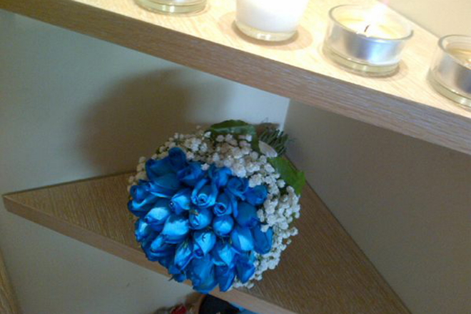 Η νύφη φόρεσε ένα κοντό λευκό νυφικό που σχεδίασε ο καλός της φίλος Χρήστος Πετρίδης, ενώ εντύπωση προκάλεσε το εντυπωσιακό νυφικό μπουκέτο από μπλε τριαντάφυλλα.