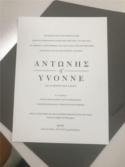 Η λευκή πρόσκληση γράφει: «Με μεγάλη χαρά σας προσκαλούμε στην πιο σημαντική στιγμή της ζωής μας, το γάμο μας, το Σάββατο 15 Σεπτεμβρίου 2018, στις 19.00, στην Βαρυπόμπη. Η παρουσία σας θα μας τιμήσει ιδιαίτερα».