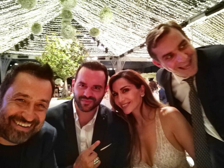 Το μυστήριο τελέστηκε με κουμπάρους τον επιστήθιο φίλο του τραγουδιστή Κώστα Πηλαδάκη, την κολλητή φίλη του μοντέλου και σχεδιάστριας, Μαρία Μπεκατώρου, τον ισχυρό άνδρα του Nammos Γιάννη Παπαλέκα, αλλά και τον πρόεδρο του Alpha, Δημήτρη Κοντομηνά.