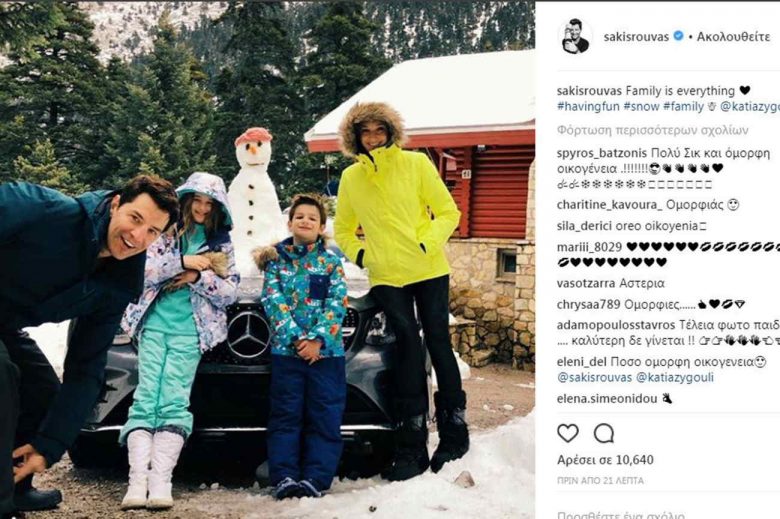 Στο πρώτο στιγμιότυπο που δημοσίευσε ο τραγουδιστής τον βλέπουμε να ποζάρει, φορώντας τη μάσκα του σκι, ενώ στο δεύτερο ποζάρει, με φόντο ένα χιονάνθρωπο, μαζί με την Κάτια Ζυγούλη και τα δύο μεγαλύτερα παιδιά του, Αναστασία και Αλέξανδρο.