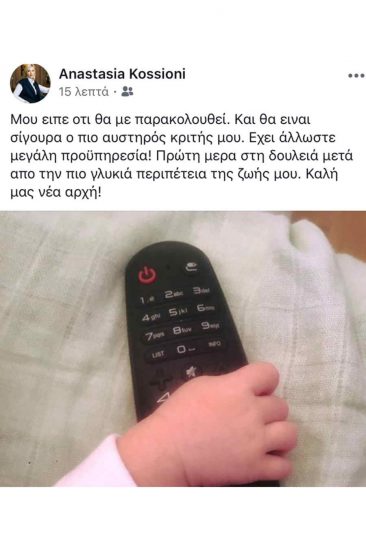 Μετά από απουσία δύο μηνών, η δημοσιογράφος, επιστρέφει στο πόστο της και θα αναγκαστεί να αποχωριστεί το γιο της. Ανέβασε μια γλυκιά φωτογραφία του στο facebook όπου τον βλέπουμε να κρατά ένα τηλεκοντρόλ και την ίδια να σχολιάζει: «Μου είπε ότι θα με παρακολουθεί. Και θα είναι σίγουρα ο πιο αυστηρός κριτής μου.Έχει άλλωστε μεγάλη προϋπηρεσία! Πρώτη μέρα στη δουλειά μετά από την πιο γλυκιά περιπέτεια της ζωής μου. Καλή νέα μας αρχή!».
