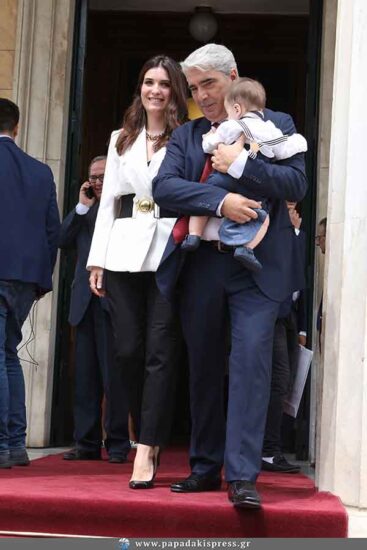 Η σύζυγός του Ελιβάβετ Κατσαμάκη πάντα στο πλευρό του, ενώ στα χέρια του κρατούσε με χαρά και περηφάνια, τον γιο τους τον οποίο αποχωρίστηκε μόνο κατά τη διάρκεια της ορκωμοσίας του.