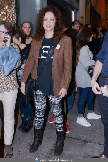 Σε μια από αυτές, τη συνάντησε ο φωτογραφικός μας φακός. Η τραγουδίστρια η οποία γνώρισε μεγάλη επιτυχία στα τέλη της δεκαετίας του ΄80, βρέθηκε στο θέατρο Βέμπο προκειμένου να παρακολουθήσει την παράσταση «Μακρυκωσταίοι και Κοντογιώργηδες». Και όπως έγινε αμέσως αντιληπτό, παραμένει εξίσου εντυπωσιακή και ευδιάθετη δέχθηκε με χαρά να φωτογραφηθεί για εμάς.